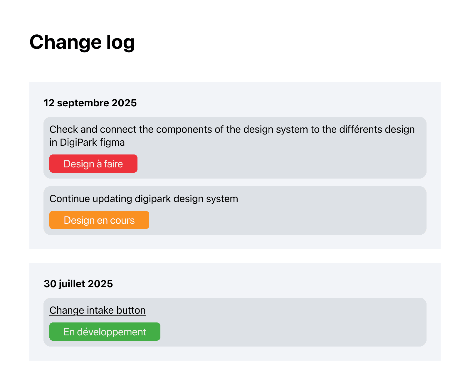 Afin de guider les nouveaux designers dans leur prise en main, la page « Changelog » offre une vue d’ensemble des tickets et des missions liées au design.