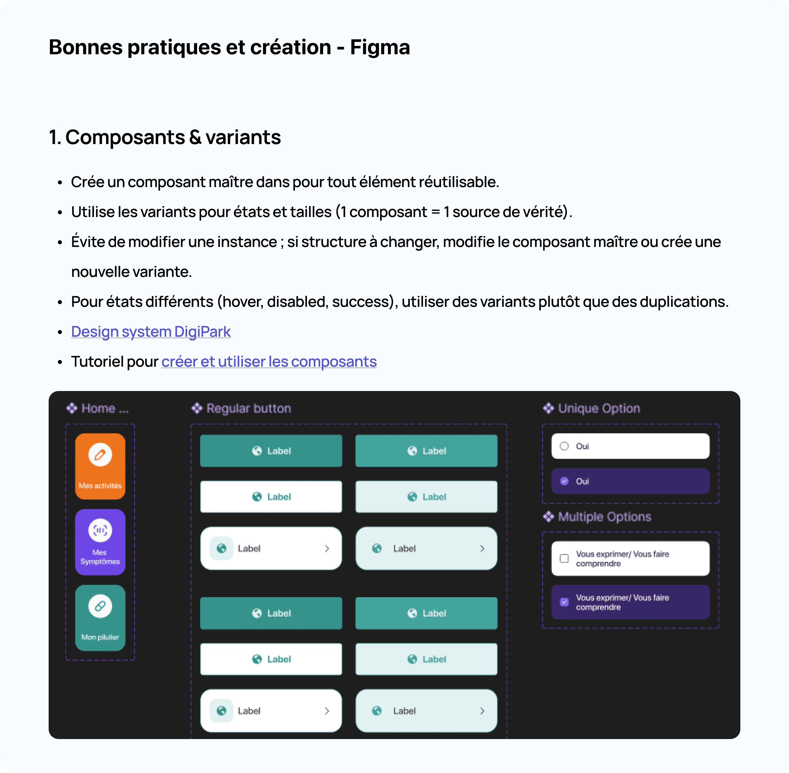 Afin d’assurer une passation efficace auprès de designers aux niveaux d’ancienneté variés, j’ai rédigé une page « Bonnes pratiques » centralisant l’ensemble des règles et références à appliquer dans les maquettes Figma.